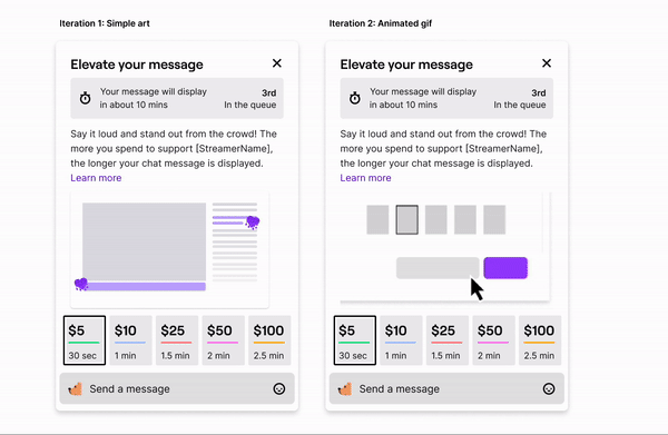 Once viewers click an entry point, they see a card with all the prices, durations, and different visual offerings. The more a user pays, the longer their message would be pinned. The preview image changes and renders their message as the user types. If we had more engineering resources on this project, I would have made the preview and input field be one piece in order to reduce vertical space and redundancy.